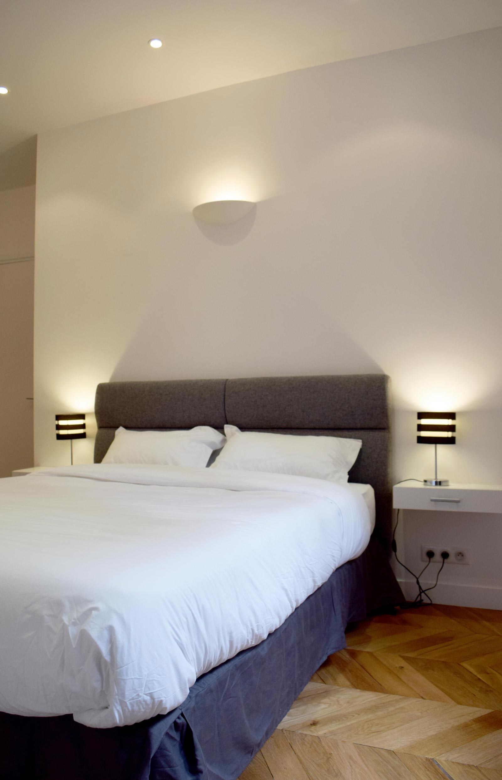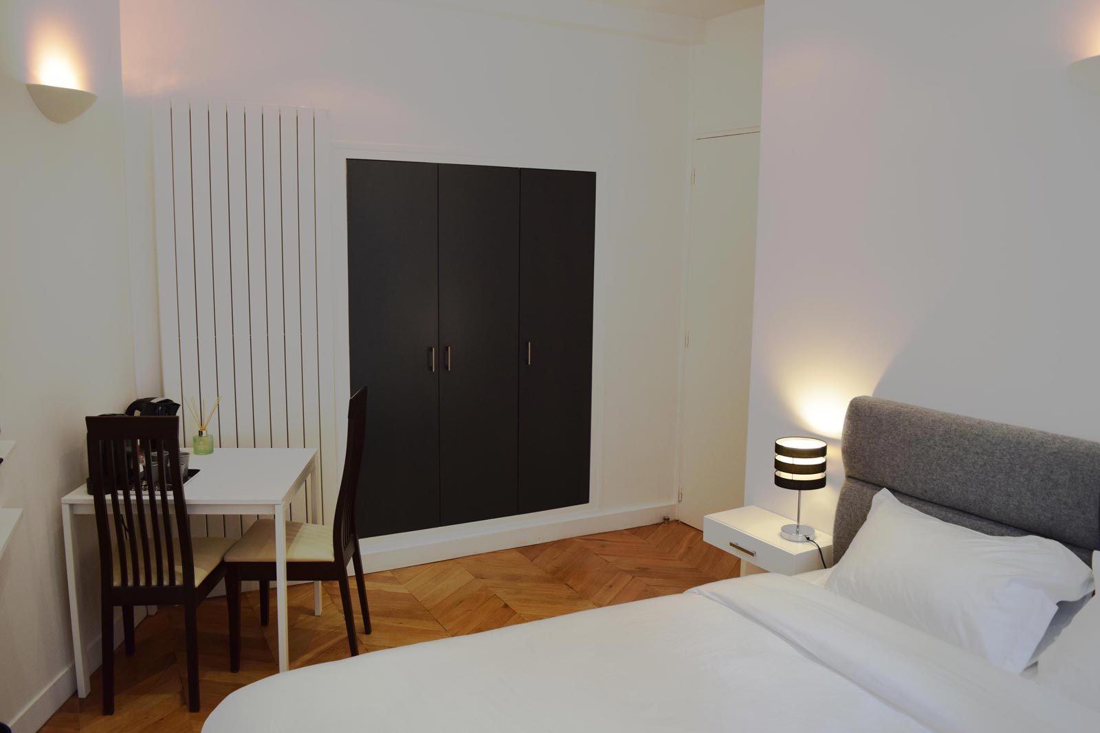 The Bastille Deluxe Bedroom (180sqft) faces the grey roof of a small house located in the inner courtyard of the building, which is typically parisian. It is the most quiet bedroom of the questhouse. The separate entrance by dedicated stairs is ideal for those seeking a romantic secret parisian atmosphere. The dining table, equipped with universal power adapter outlets and complimentary high-speed internet access, provides the convenience of an office away from home.